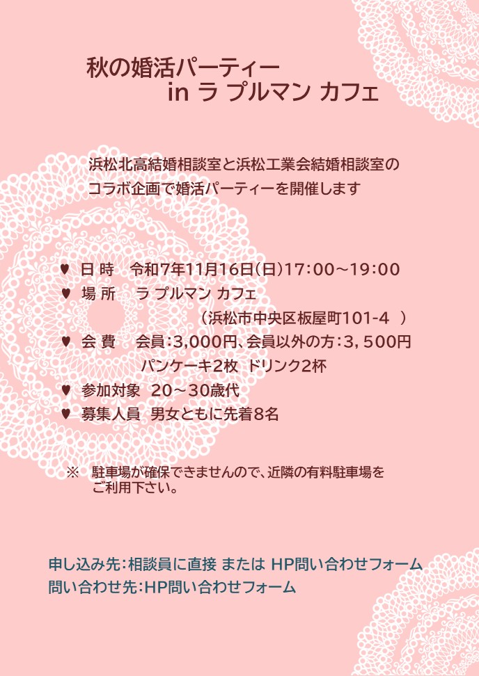 浜松北高結婚相談室と工業会結婚相談室コラボ企画として婚活パーティーを開催することになりました。